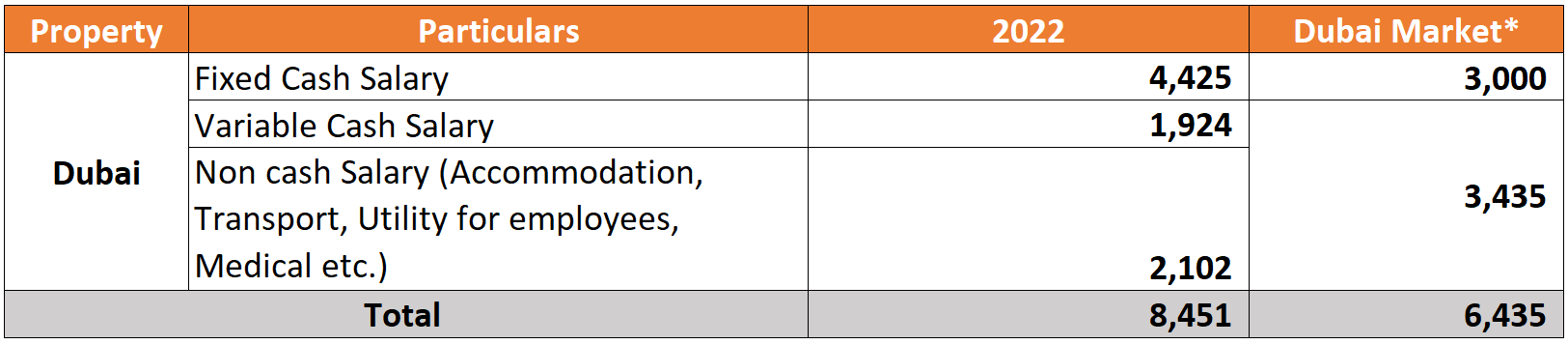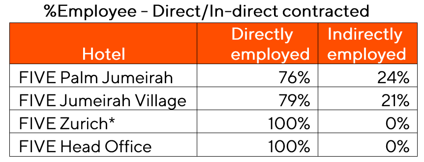 Although the UAE does not maintain an official minimum wage requirement, FIVE provides all its employees with salaries and benefits that ensure a safe, decent living wage covering the minimum resources necessary for long-term wellbeing. In addition to a fixed and variable pay, FIVE provides its employees with benefits including accommodation and utilities, food, transportation, health care, and a mandatory return ticket to home country. FIVE has compiled a table providing a break down on its payment wages and benefits with ascribed monetary value as computed by FIVE’s Finance Department based on annual expenditures. The data demonstrates that FIVE pays its employees a minimum living wage above the average living wage reported in the UAE, as per public data sources including Dubai’s leading housing and rental platform, Property Finder and economic source, Dubai Multi Commodities Centre (DMCC).