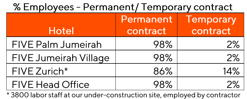 As an organization in the hospitality and real-estate sector, our FIVE Tribe represents our most important asset. They are the fundamental stakeholders for us, critical to executing our daily operations at world-class standards and securing the long-term growth and development of our organization. FIVE emphasizes in creating value for its diverse tribe of over 60 nationalities by providing the corporate governance, policies, procedures, and resources to ensure holistic employee wellbeing, growth, learning and development. Fundamentally, FIVE maintains a comprehensive framework to ensure employee health and safety, accessibility to basic facilities (including availability to water), core human rights, promotion of diversity and equal employment opportunities, and measures against any form of discrimination, corruption, child or forced labour or modern slavery. We foster a culture of freedom of association and collective bargaining by encouraging our workforce to express their perspectives and to submit solutions that serve the continual progress and improvement of all of FIVE’s colleagues.