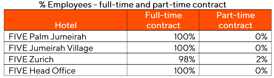 Part-time to full-time workforce – FIVE does not have any temporary or part-time contracts with any of its employees. 100% of the company’s employed workforce is employed full-time with FIVE.In the case of FIVE Zurich, third-party employees are hired on a need basis for additional hours/ days. Considering the flexibility and working timelines, a total of XX hours for Zurich has been availed through indirectly employed personnel. Total employee headcount for Zurich is 138 employees as on December 31, 2022.