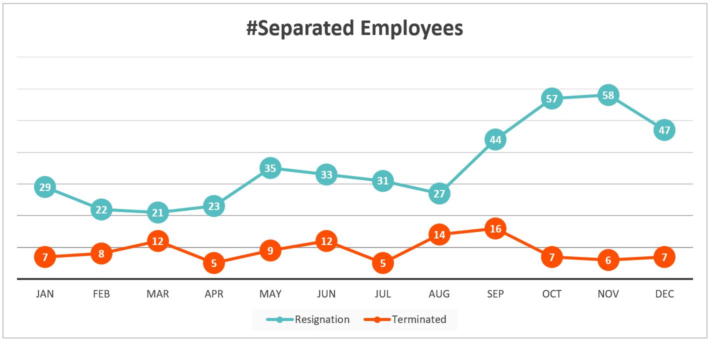 At FIVE, we believe in the value and support of every employee, which is why we have never implemented any large-scale redundancies over the past three years. As reflected in the provided graph, terminations have remained relatively constant throughout the year, primarily stemming from performance-based issues rather than a singular event leading to widespread redundancies. This approach highlights our unwavering commitment to the well-being and professional growth of our team members and upholding our pledge to avoid large-scale redundancies.