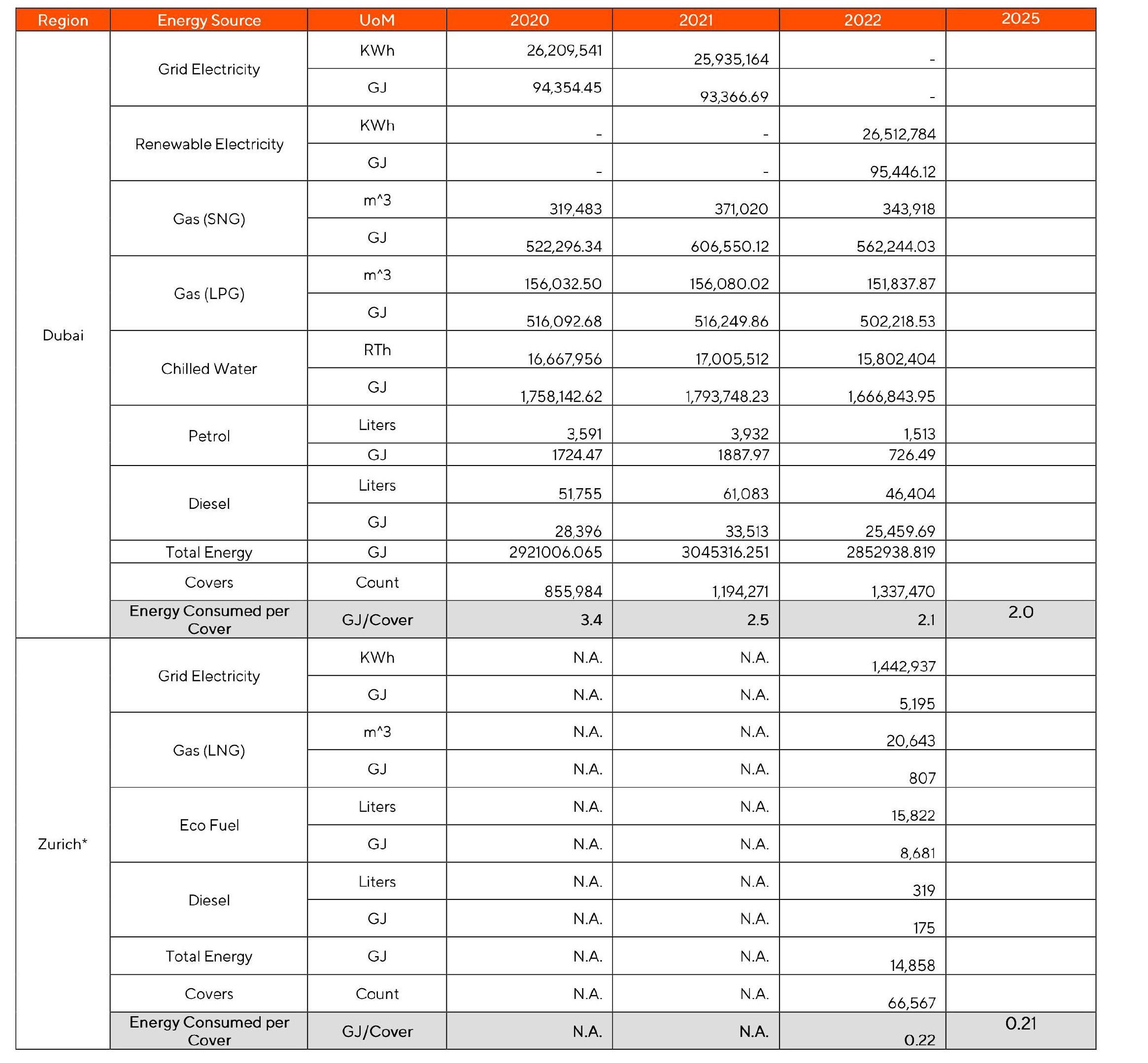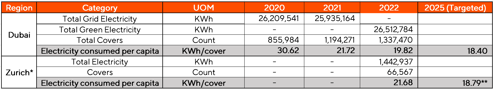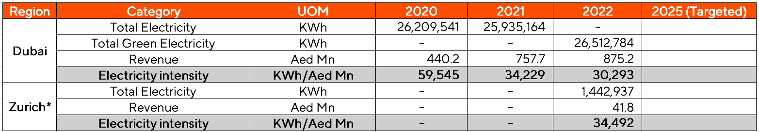 **We have created an overall target of reducing electricity consumed per capita by 5% for both Dubai and Zurich. In case of Zurich, we do not have a baseline in place since we have not completed an entire year for reporting.