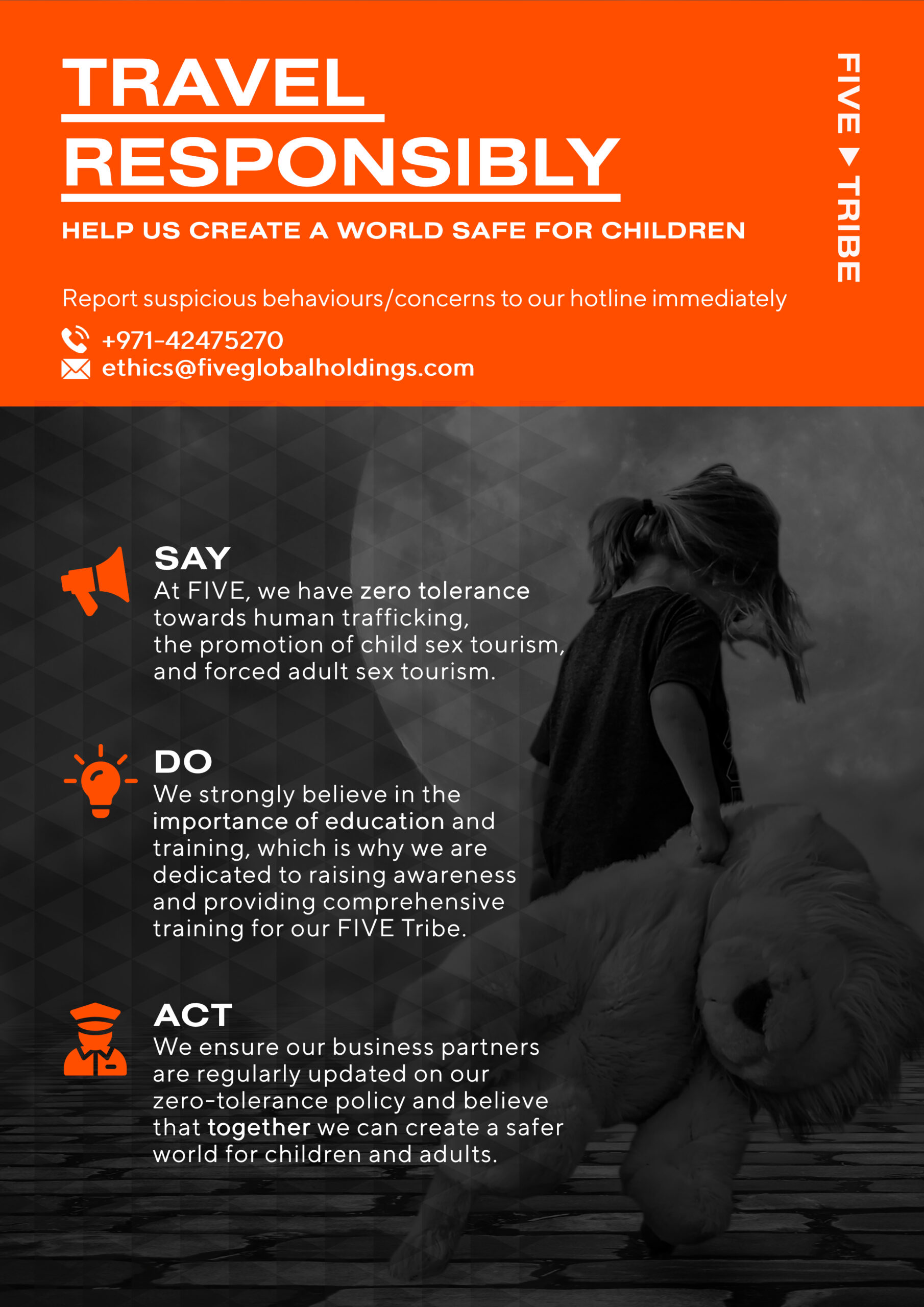 FIVE Code of Conduct follows the United Nations Global Compact which covers the ten principles on Human Rights, Labor, Environment and Anti-corruption
